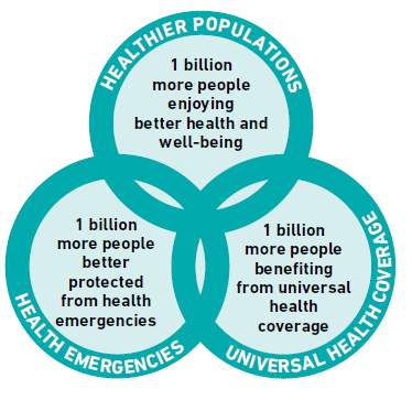 GPW是围绕三个策略重点和相关目标构建的(见图1)。三个策略重点是全民健康覆盖,应对卫生突发事件和促进健康人群。与2023年相关的目标是所谓的“三十亿目标”:10亿人受益于全民健康覆盖,10亿人更好地免受卫生突发事件的影响,10亿人享受更好的健康和福利。世卫组织和世界银行估计,在2015年,只有大约一半的世界人口能够获得基本卫生服务。实现这三个目标有赖于会员国、世卫组织和其他伙伴的共同努力。