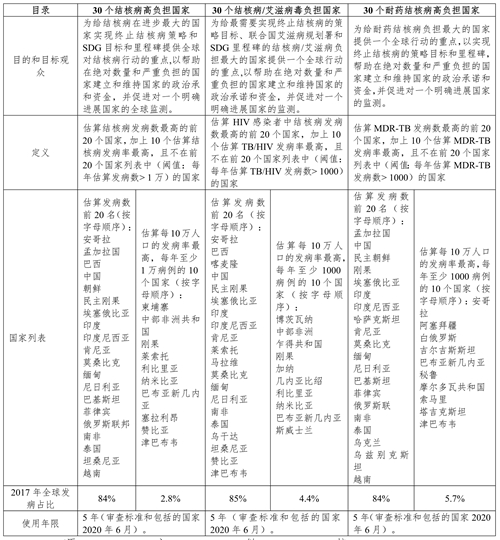 本报告对30个结核病高负担国家给予特别关注。在估算结核病/艾滋病和耐多药结核疾病负担影响下,分别对结核病/艾滋病和耐多药结核国家名单给予特别关注。
